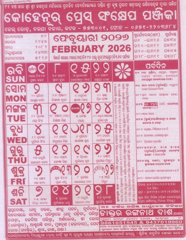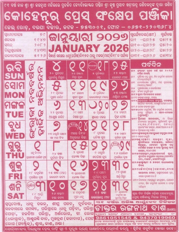 Complete 2026 Odia calendar including festival dates, marriage muhurta, griha pravesh, Ekadashi, vrat list and official Odisha government holidays.